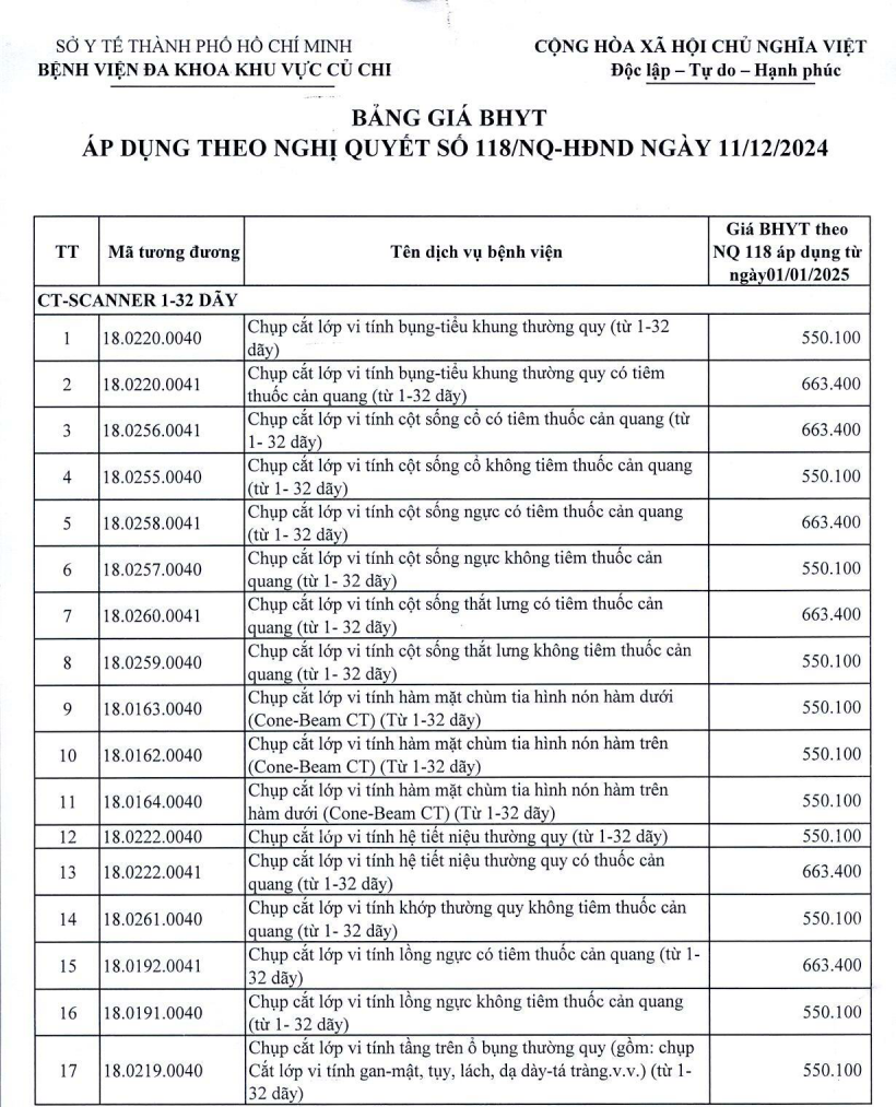 Bảng giá BHYT áp dụng theo Nghị Quyết số 118/NQ-HĐND ngày 11/12/2024