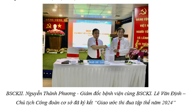 Đặc biệt, cuối chương trình hội nghị, BSCKII. Nguyễn Thành Phương – Giám đốc bệnh viện cùng BSCKI. Lê Văn Định – Chủ tịch Công đoàn cơ sở đã ký kết “Giao ước thi đua tập thể năm 2024” với nhiều nội dung, trọng tâm nhấn mạnh: Tổ chức đưa vào hoạt động hiệu quả bệnh viện mới. Khai thác hiệu quả cơ sở vật chất, trang thiết bị y tế thuộc gói thầu trang thiết bị y tế của “Dự án xây dựng bệnh viện mới”. Chuẩn bị các điều kiện về nhân sự chuyên môn và quản lý để tiếp nhận và vận hành bệnh viện mới; Phấn đấu đạt mức chất lượng bệnh viện từ 4.0 trở lên (Theo Bộ tiêu chí chất lượng bệnh viện Việt Nam ban hành theo Quyết định số 6858/QĐ-BYT ngày 18/11/2016 của Bộ trưởng Bộ Y tế) góp phần nâng hạng bệnh viện lên hạng I theo Nghị quyết Đảng bộ Bệnh viện nhiệm kỳ 2020-2025; Thành lập các đơn vị mới như: Đơn vị Cơ xương khớp, Đơn vị Tim mạch can thiệp, Đơn vị Da liễu, Đơn vị Ung thư; …Tăng cường công tác nghiên cứu khoa học, sáng kiến cải tiến, áp dụng khoa học kỹ thuật hiện đại vào tiến trình phát triển toàn diện bệnh viện