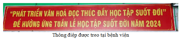 Trong tuần lễ từ ngày 01 đến 07 tháng 10 năm 2024, Bệnh viện đã tổ chức các hoạt động với mục tiêu tạo ra môi trường học tập hiệu quả. Thông điệp “Phát triển văn hóa đọc, thúc đẩy học tập suốt đời” được lan tỏa qua các băng rôn treo tại bệnh viện, khuyến khích toàn thể viên chức tích cực tham gia học tập.