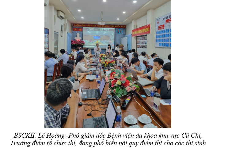 BSCKII. Lê Hoàng Phó giám đốc Bệnh viện đa khoa khu vực Củ Chi, cũng là Trưởng điểm tổ chức thi cho các thí sinh cho biết thêm: Hội thi này, lần đầu tiên được Sở Y tế phối hợp với Bảo hiểm Xã hội tổ chức và đây là 1 sân chơi lớn mà Sở Y tế đã dầy công, tâm huyết chuẩn bị cho các đơn vị. Hội thi “Thầy thuốc giỏi chuyên môn, vững Bảo hiểm y tế” có ý nghĩa lớn không chỉ đối với các thí sinh tham gia thi mà còn với các đơn vị được Sở Y tế chọn làm điểm tổ chức cho các thí sinh thi. Là 1 trong số các đơn vị vinh dự được phân công đăng cải tổ chức điểm thi tại huyện Củ Chi, Bệnh viện Đa khoa Khu vực Củ Chi đã lên kế hoạch chuẩn bị, phân công nhân sự, các nội dung tổ chức, chuẩn bị trang thiết bị máy móc, đường truyền, hỗ trợ cho các thí sinh, đều được bệnh viện thực hiện chu đáo. Đặc biệt là công tác phân công giám sát điểm thi được bệnh viện phân công chặt chẽ, tại điểm thi các nhân sự được bố trí coi thi là những nhân sự có kinh nghiệm tổ chức coi thi của bệnh viện, yêu cầu tất cả các thí sinh bước vào điểm thi phải chấp hành nghiêm nội quy, không được sử dụng tài liệu, điện thoại, thiết bị ghi hình …, nếu vi phạm thí sinh sẽ mất quyền thi và không được tham gia thi vòng 2. Hội thi lần này Bệnh viện Đa khoa Khu vực Củ Chi cũng cử 22 thí sinh là các bác sĩ lãnh đạo các khoa/ phòng tham gia Hội thi. Các thí sinh tham dự hội thi là các bác sĩ giỏi chuyên môn, am hiểu kiến thức về Luật Khám bệnh, chữa bệnh, Luật Bảo hiểm y tế, nắm vững các quy định về thanh quyết toán chi phí khám, chữa bệnh bảo hiểm y tế.