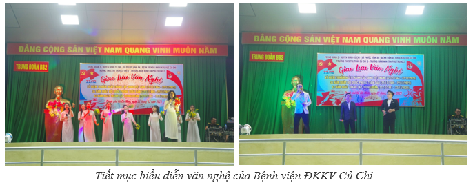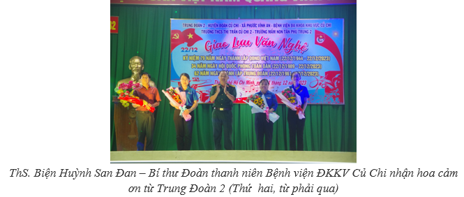 Chương trình được cán bộ, chiến sỹ đơn vị phối hợp với các đơn vị kết nghĩa trên địa bàn với 14 tiết mục ca, múa, nhạc đặc sắc ca ngợi Đảng, Bác Hồ, ca ngợi truyền thống anh hùng của Quân đội nhân dân Việt Nam trong 79 năm xây dựng, chiến đấu và trưởng thành. Ca ngợi quê hương, đất nước và lực lượng vũ trang . Chương trình được dàn dựng công phu, diễn ra thành công tốt đẹp và để lại nhiều ấn tượng trong lòng người xem. Đến dự với chương trình giao lưu, Bệnh viện Đa khoa Khu vực Củ Chi có dịp gặp gỡ lãnh đạo Trung Đoàn 2, được các Đồng chí Trung Đoàn 2 chia sẻ về những thuận lợi, khó khăn trong quá trình công tác. Các đồng chí gửi gắm sự kỳ vọng của mình đến các bạn Đoàn viên thanh niên Bệnh viện luôn nổ lực ra sức phấn đầu, cống hiến cho sự nghiệp chăm sóc sức khỏe nhân dân nước nhà nói chung và trên địa bàn huyện Củ Chi nói riêng.