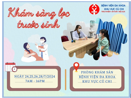 Bệnh viện Đa Khoa Khu Vực Củ Chi tổ chức chương trình “Khám sàng lọc trước sinh” cho các cặp vợ chồng trong độ tuổi sinh sản, thanh niên nam nữ sắp kết hôn và vị thành niên, thanh niên trên địa bàn huyện Củ Chi từ ngày 24 – 28/7/2024.