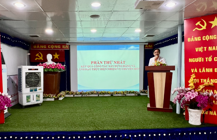 DSCKI. Nguyễn Tấn Phương đại diện Chi bộ Dược báo cáo tham luận về kết quả công tác lãnh đạo thực hiện nhiệm vụ chính trị của chi bộ mình để nhân rộng phương thức sinh hoạt chi bộ hiệu quả
