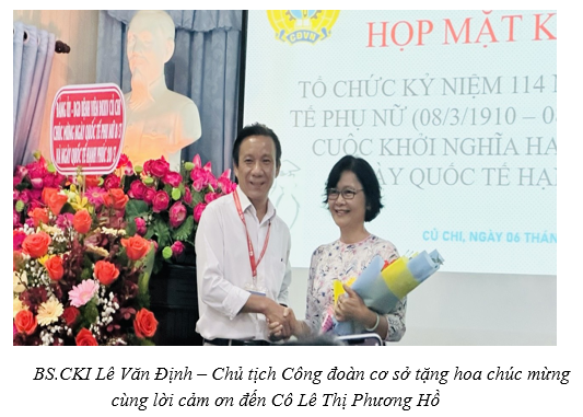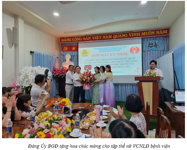 Sáng ngày 6/3/2023, được sự nhất trí và cho phép của Đảng ủy – Ban Giám đốc, Công đoàn cơ sở Bệnh viện Đa khoa khu vực Củ Chi đã tổ chức buổi lễ Kỷ niệm 114 năm Ngày Quốc tế Phụ nữ (8/3/1910 – 8/3/2024), 1984 năm cuộc khởi nghĩa Hai Bà Trưng và Ngày Quốc tế Hạnh phúc 20/3, tại hội trường 2 bệnh viện.