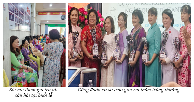 Năm nay, Ban tổ chức buổi lễ đã chuẩn bị nhiều trò chơi hấp dẫn, nhằm tạo sự vui tươi, phấn khởi cho các chị em tham gia như: Rút thăm trúng thưởng, hoạt động “Hái hoa dân chủ – Trải nghiệm” trả lời các câu hỏi trắc nghiệm về các nội dung lịch sử hình thành và phát triển ngày quốc tế phụ nữ (8/3/1910 – 8/3/2024),1984 năm cuộc khởi nghĩa hai bà trưng và ngày quốc tế hạnh phúc 20/3, trò chơi dân gian, thu hút sự tham gia sôi nổi của đại biểu tham dự và nhận được nhiều phần quà lưu niệm ý nghĩa. Bên cạnh đó, Ban Chấp hành Công đoàn bệnh viện đã tổ chức hoạt động vận động hưởng ứng Tuần lễ áo dài, phát động chương trình “Áo dài – trao gửi yêu thương” nhằm trao tặng áo dài cho nữ VCNLĐ có hoàn cảnh khó khăn, tổ chức phát động và đăng ký phong trào thi đua “Giỏi việc nước – Đảm việc nhà” giai đoạn 2024 -2025. Buổi lễ thành công tốt đẹp và khép lại trong tiếng cười và niềm vui của các chị em.