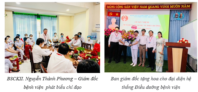 Phát biểu tại buổi Lễ, BSCKII. Nguyễn Thành Phương – Giám đốc bệnh viện ghi nhận và tôn vinh những đóng góp quan trọng của người điều dưỡng, hộ sinh trong công tác chăm sóc người bệnh, khẳng định điều dưỡng là một trong những trụ cột của bệnh viện, của hệ thống y tế. Nhắn nhủ đến mỗi điều dưỡng, nữ hộ sinh của bệnh viện phấn đấu học tập, nâng cao y đức, kiến thức tay nghề, chăm sóc người bệnh như chính người thân của mình. Thông điệp của Hội đồng Điều dưỡng Thế giới năm nay: “Điều dưỡng chúng ta – Tương lai của chúng ta”, cũng đã khẳng định rõ vai trò của hệ thống điều dưỡng. Hiện nay bệnh viện đang tập trung các giải pháp nhằm đổi mới căn bản và toàn diện về công tác điều dưỡng, từng bước nâng cao hơn nữa chất lượng chăm sóc người bệnh, tiến tới hội nhập điều dưỡng khu vực và quốc tế.