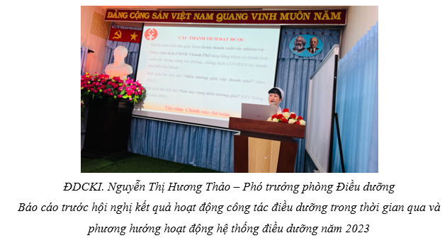 Tiếp đó, ĐDCKI. Nguyễn Thị Hương Thảo – Phó trưởng phòng Điều dưỡng đã báo cáo trước hội nghị kết quả hoạt động công tác điều dưỡng trong thời gian qua cũng như những phương hướng hoạt động để góp phần định hướng, phát triển hoạt động của hệ thống điều dưỡng trong bệnh viện ngày càng hiệu quả hơn. Đồng thời nhấn mạnh: “Trong thời kỳ nào, người điều dưỡng cũng đóng vai trò không thể thiếu trong công tác chăm sóc sức khỏe cho người bệnh. Chính sự tận tâm phục vụ, những hy sinh thầm lặng của họ đã góp phần tạo nên sự thành công của các bệnh viện. Chất lượng của một bệnh viện phụ thuộc nhiều vào thái độ, sự chuyên tâm và tận tụy của chính những người điều dưỡng”