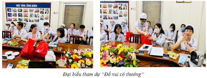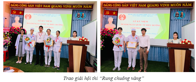 Trong chương trình hội nghị, bên cạnh các câu hỏi đố vui có thưởng, ban tổ chức cũng đã tiến hành biểu dương khen thưởng các hoạt động nằm trong chuỗi sự kiện nhằm kỷ niệm ngày Quốc tế Điều dưỡng 12/05/2023. Bệnh viện Đa Khoa Khu Vực Củ Chi đã tổ chức hội thi “ Rung chuông vàng” dành riêng cho lực lượng điều dưỡng, Nữ hộ sinh, kỹ thuật viên tại bệnh viện. Đây là hoạt động nhằm tạo phong trào thi đua học tập nâng cao trình độ chuyên môn, rèn luyện kỹ năng thực hành, hướng dẫn, chăm sóc người bệnh cho Điều dưỡng, Hộ sinh, Kỹ và thuật viên. Bên cạnh đó, đánh giá cao vai trò, sự hy sinh của những điều dưỡng viên, KTV, NHS trong công tác chăm sóc, bảo vệ sức khỏe, phòng chống bệnh dịch và đặc biệt là đại dịch COVID-19. Họ là những người đã hỗ trợ, đồng hành cùng các y bác sĩ và bệnh nhân trong quá trình khám, chữa bệnh, cũng như quá trình nằm viện điều trị của bệnh nhân, thân nhân.Ban tổ chức đã trao giải Nhất thuộc về thí sinh CNHS Trần Hồng Thu – khoa Sản; Giải Nhì thuộc về thí sinh CNĐD Nguyễn Thị Loan – khoa Nhi; giải Ba thuộc về thí sinh CNĐD Phạm Thế Trung – khoa PTGMHS; 02 giải khuyến khích thuộc về thí sinh YS Lê Thị Kim Luôn – khoa Xét Nghiệm và thí sinh CNĐD Nguyễn Thị Hồng Tựa – khoa CCTH; và giải tập thể khoa có nhiều thí sinh vào vòng 3 nhiều nhất thuộc về khoa Nội tổng quát. Đây không chỉ là sân chơi bổ ích, lành mạnh cho các điều dưỡng viên mà còn động viên điều dưỡng yêu nghề, tự hào về nghề nghiệp, tiếp tục nâng cao y đức, tay nghề nhằm phục vụ chăm sóc sức khỏe người bệnh, người dân ngày càng tốt hơn và cũng là dịp tôn vinh những người làm công tác Điều dưỡng và những đóng góp của diều dưỡng với người bệnh, ngành y tế.