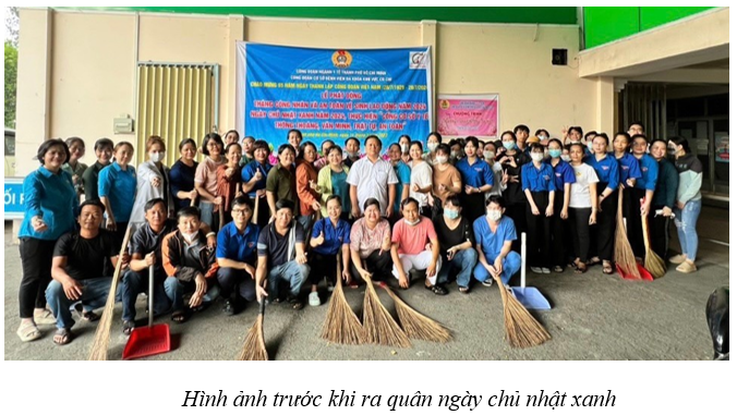 Ban Thường vụ Công đoàn cơ sở bệnh viện Đa khoa Khu vực Củ Chi lên kế hoạch tổ chức phong trào “Ngày Chủ nhật Xanh” gắn với việc thực hiện “Cổng cơ sở y tế thông thoáng, văn minh, trật tự, an toàn” và hưởng ứng tháng hành động về an toàn vệ sinh lao động năm 2024. Công đoàn cơ sở phối hợp cùng Đoàn cơ sở bệnh viện đã vận động Đoàn viên Công đoàn hăng hái tham gia ngày chủ nhật xanh, đẩy mạnh tăng cường thực hiện theo tiêu chí “An toàn, sáng, xanh, sạch, đẹp” vận động đoàn viên công đoàn, viên chức, người lao động (VC-NLĐ) làm vệ sinh bệnh viện sạch, đẹp, bố trí thêm cây xanh trong khuôn viên bệnh viện.