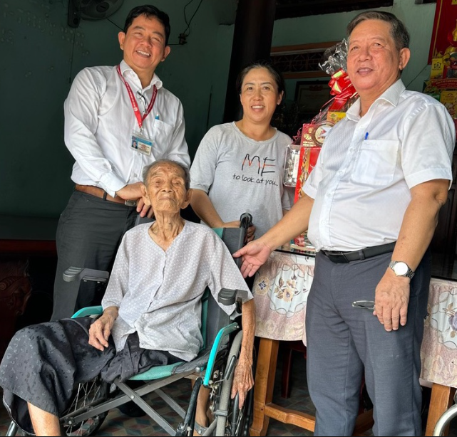 BSCKII. Nguyễn Thành Phương, Bí thư Đảng ủy – Giám đốc bệnh viện làm trưởng đoàn, cùng BSCKII. Nguyễn Minh Sang – Trưởng phòng Quản lý chất lượng đã đến thăm và tặng quà Mẹ Việt Nam Anh hùng Nguyễn Thị Thông