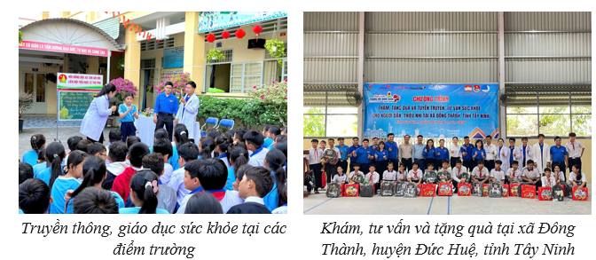 Trước khi triển khai chương trình tầm soát tại xã Tân An Hội, trong khuôn khổ Tháng Thanh niên năm 2026, Đoàn cơ sở Bệnh viện ĐKKV Củ Chi đã thực hiện chuỗi hành trình nhân ái xuyên suốt từ vùng xa đến học đường. Tiêu biểu vào ngày 24/03, đoàn công tác do đồng chí Nguyễn Đoàn Huy – Bí thư Đoàn cơ sở làm trưởng đoàn đã đến xã Đông Thành, huyện Đức Huệ, tỉnh Tây Ninh. Tại đây, đội ngũ y bác sĩ trẻ đã tổ chức khám bệnh, cấp thuốc miễn phí cho 70 người dân và mang lại niềm vui cho 100 em nhỏ thông qua các hoạt động thăm khám, vui chơi bổ ích.