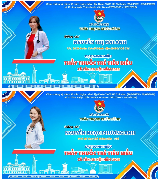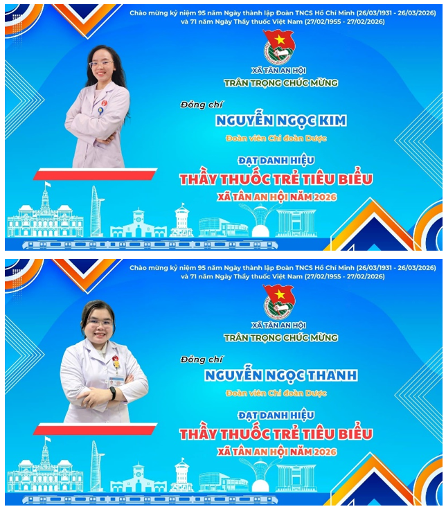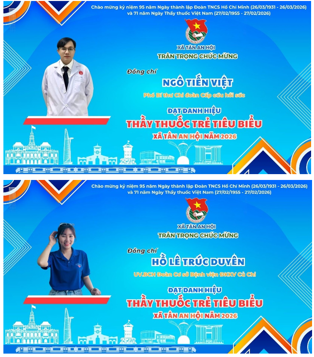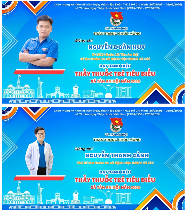 Trong không khí sôi nổi của Tháng Thanh niên, hướng tới kỷ niệm 95 năm Ngày thành lập Đoàn TNCS Hồ Chí Minh (26/03/1931 – 26/03/2026) và 71 năm Ngày Thầy thuốc Việt Nam (27/02/1955 – 27/02/2026), Bệnh viện Đa khoa Khu vực Củ Chi vui mừng và tự hào khi có 10 cá nhân xuất sắc được Ban Chấp hành Đoàn xã Tân An Hội tuyên dương danh hiệu “Thầy thuốc trẻ tiêu biểu” năm 2026.