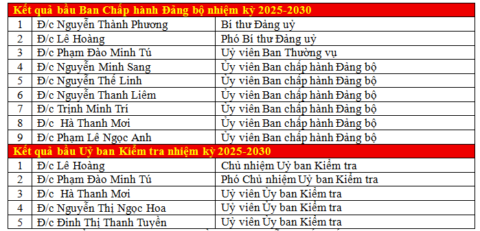 Với tinh thần dân chủ, công tâm và trách nhiệm, Đại hội đã tiến hành bầu Ban Chấp hành Đảng bộ nhiệm kỳ 2025 – 2030 gồm 9 đồng chí và Uỷ ban kiểm tra gồm 5 đồng chí có bản lĩnh chính trị, đạo đức tốt, năng lực chuyên môn vững vàng và tinh thần dấn thân phục vụ. Cụ thể:
