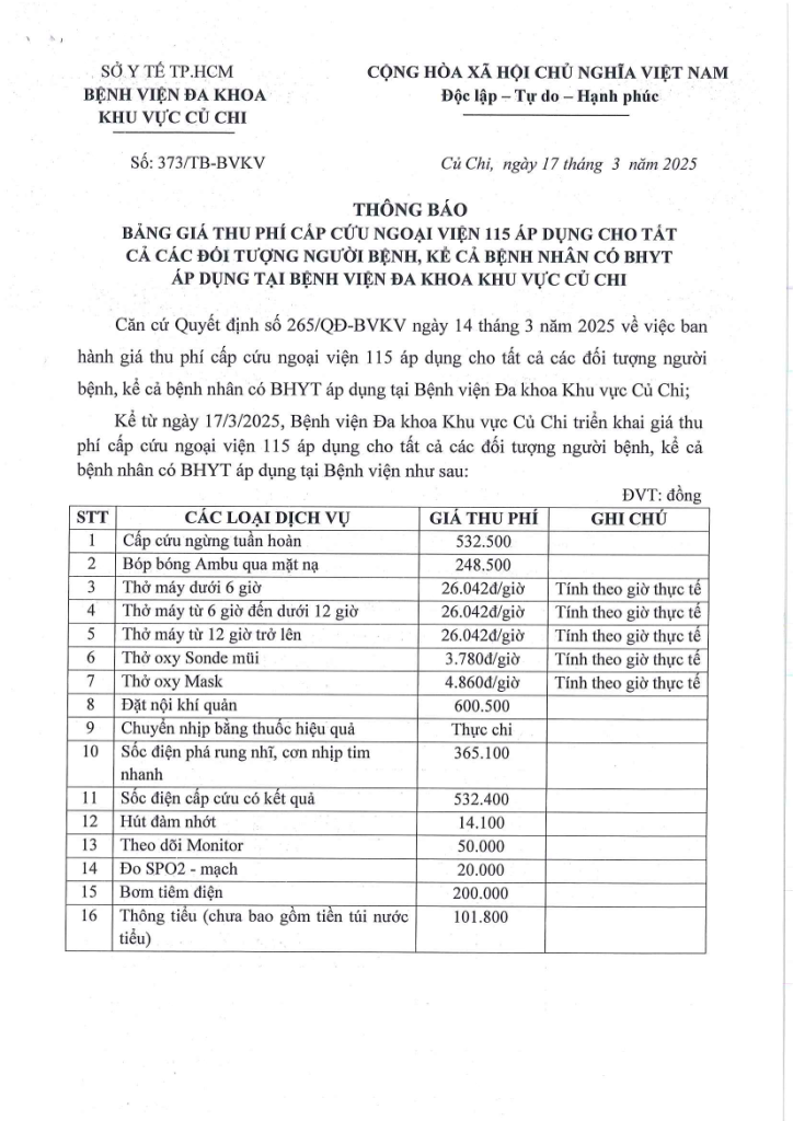 • Thông báo giá thu phí cấp cứu ngoại viện 115 áp dụng cho tất cả các đối tượng người bệnh, kể cả Bệnh nhân có BHYT áp dụng tại Bệnh viện ĐKKV Củ Chi