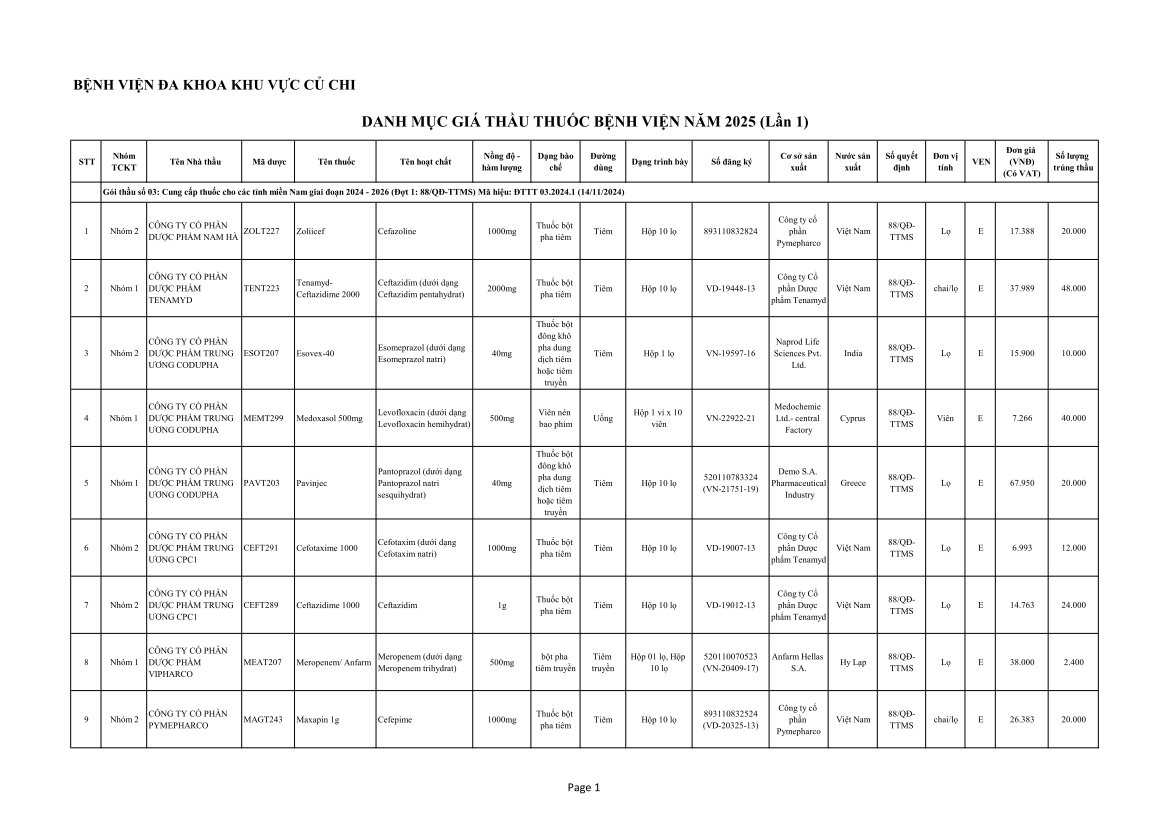 DANH MỤC GIÁ THẦU THUỐC BỆNH VIỆN NĂM 2025 (Lần 1)