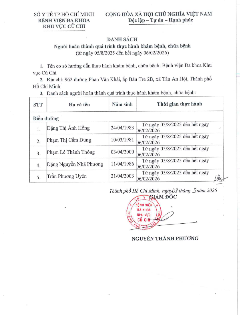 Danh sách người thực hành khám bệnh, chữa bệnh tại bệnh viện Đa Khoa khu vực Củ Chi
