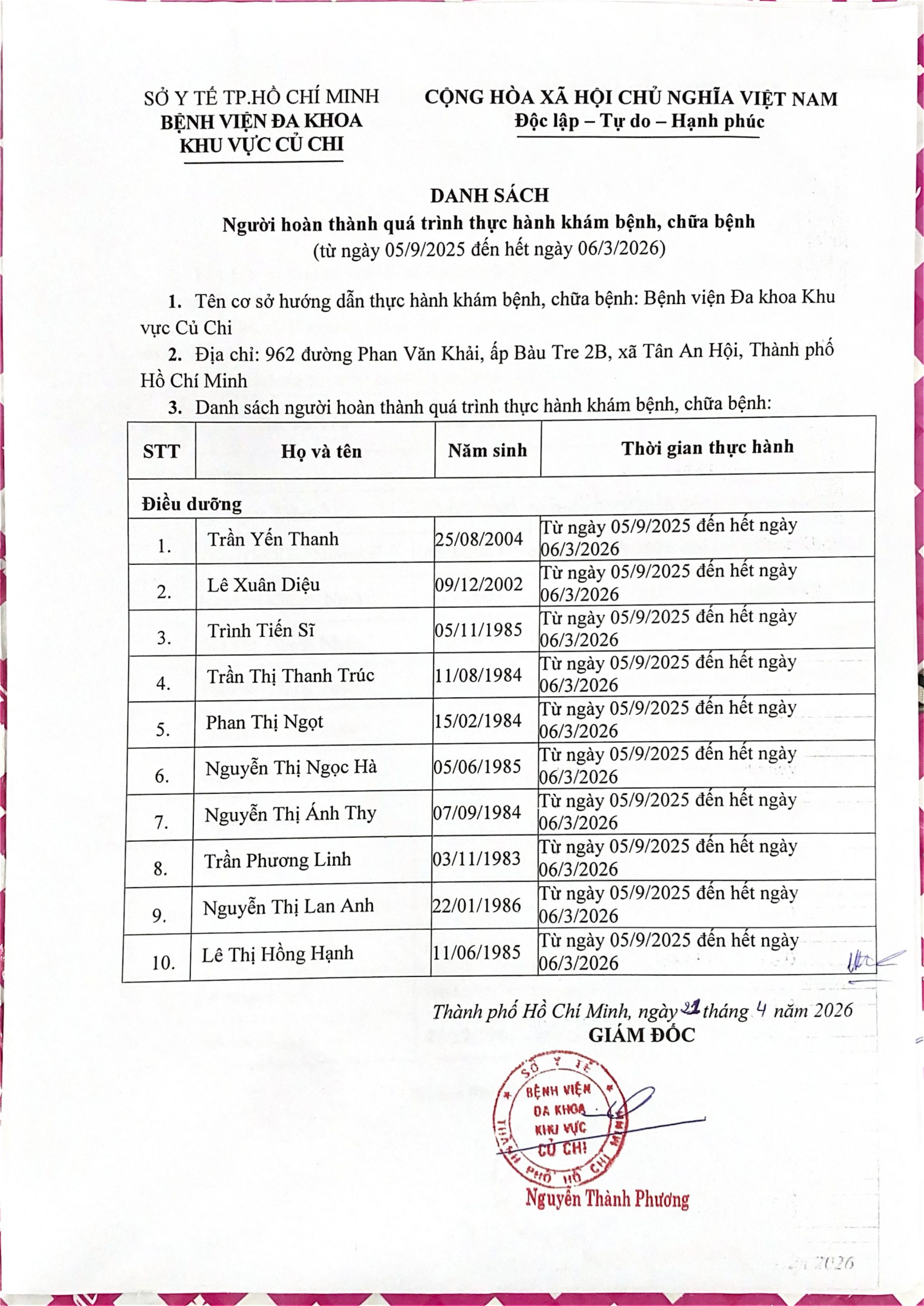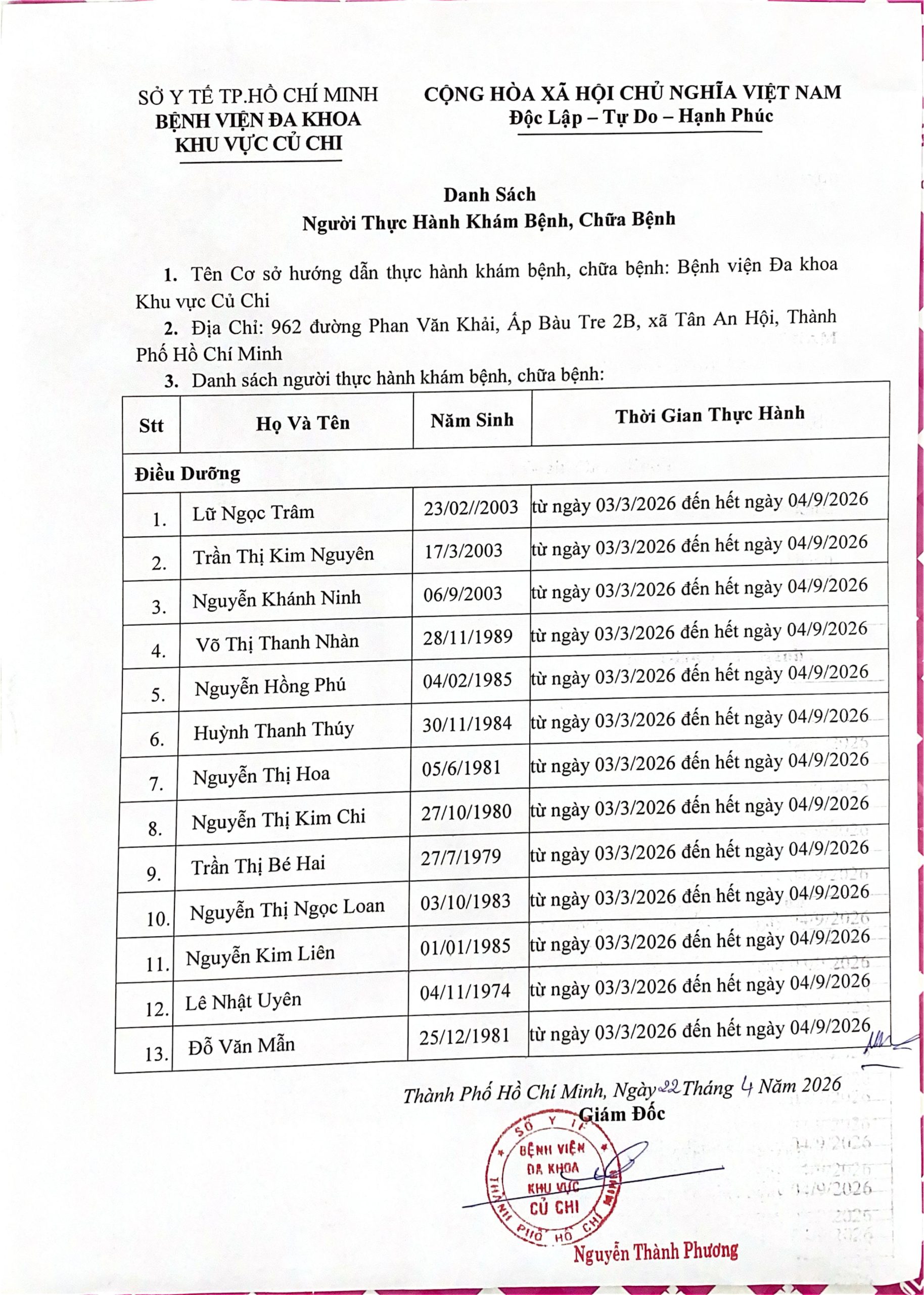 Danh sách người thực hành khám bệnh, chữa bệnh tại bệnh viện Đa Khoa khu vực Củ Chi
