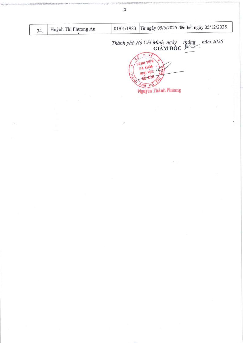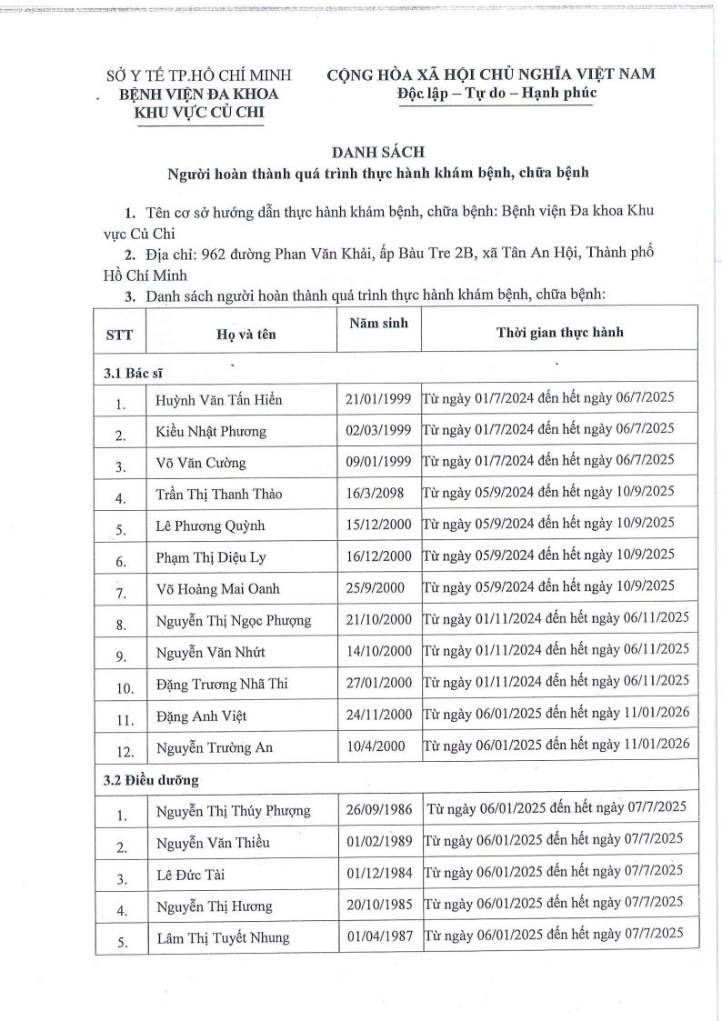 Danh sách người thực hành khám bệnh, chữa bệnh tại bệnh viện Đa Khoa khu vực Củ Chi