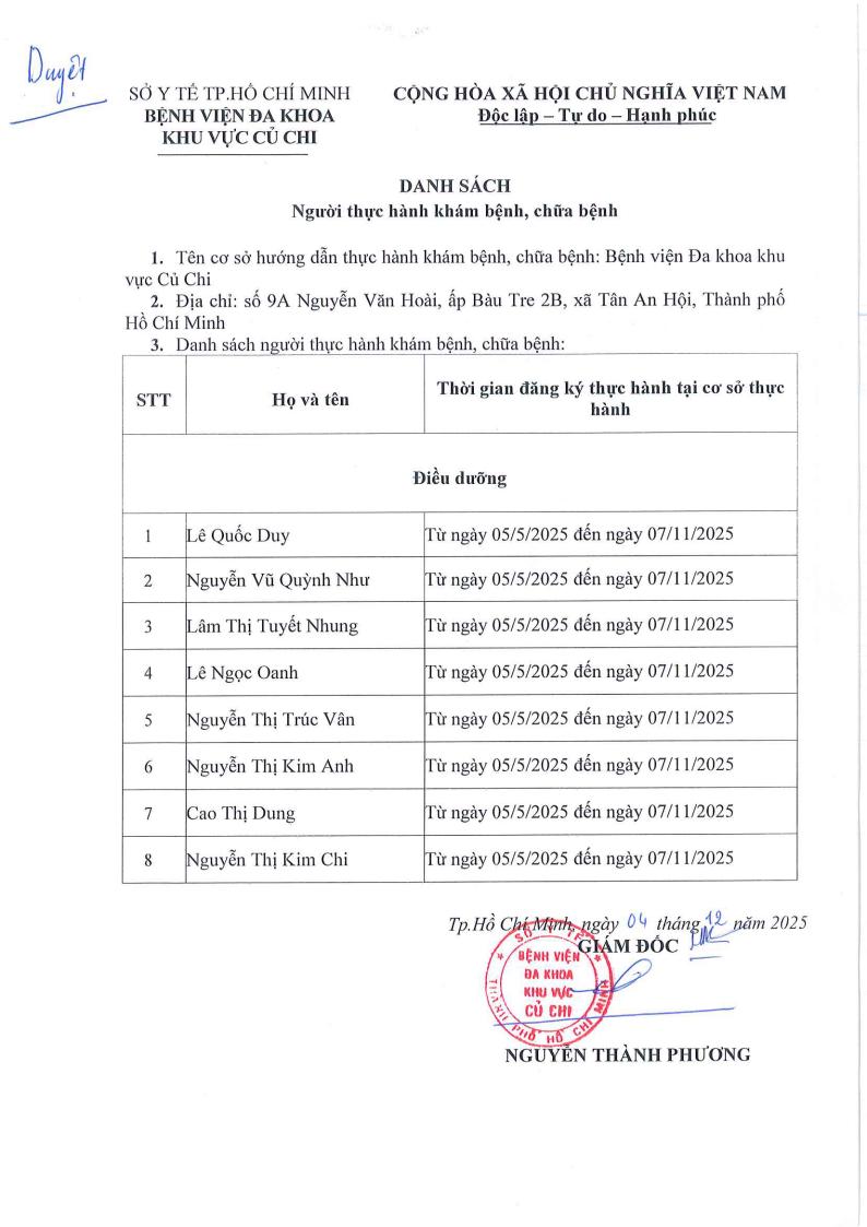 Danh sách người thực hành khám bệnh, chữa bệnh tại bệnh viện Đa Khoa khu vực Củ Chi