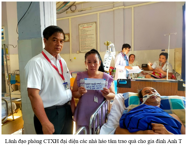 Trong suốt thời gian qua, phòng CTXH BV dưới sự giúp đỡ, ủng hộ của các nhà hảo tâm, mạnh thường quân đã trợ giúp được nhiều bệnh nhân nghèo tại Bệnh viện với nhiều hình thức khác nhau. Chúng tôi rất trân trọng những nghĩa cử cao đẹp, tấm lòng và sự tận tâm mà các đơn vị tài trợ, các nhà hảo tâm, quý ân nhân đã dành cho các bệnh nhân cũng như trường hợp của Anh T. Sự giúp đỡ, chia sẻ đó có ý nghĩa rất lớn đối với anh và gia đình lúc này, giúp anh vượt qua những khó khăn hiện tại, tiếp thêm cho anh và gia đình “sức mạnh” vượt qua bệnh tật hiểm nghèo. Số tiền mà các nhà hảo tâm gửi giúp anh có thêm điều kiện chữa trị thật tốt.  Số tiền đó được gia đình anh thống nhất dùng vào việc chi trả viện phí và các khoản chi phí sinh hoạt khác cho anh. Số còn lại sẽ được chuyển đến phòng tài vụ và sẽ hoàn trả khi anh xuất viện.