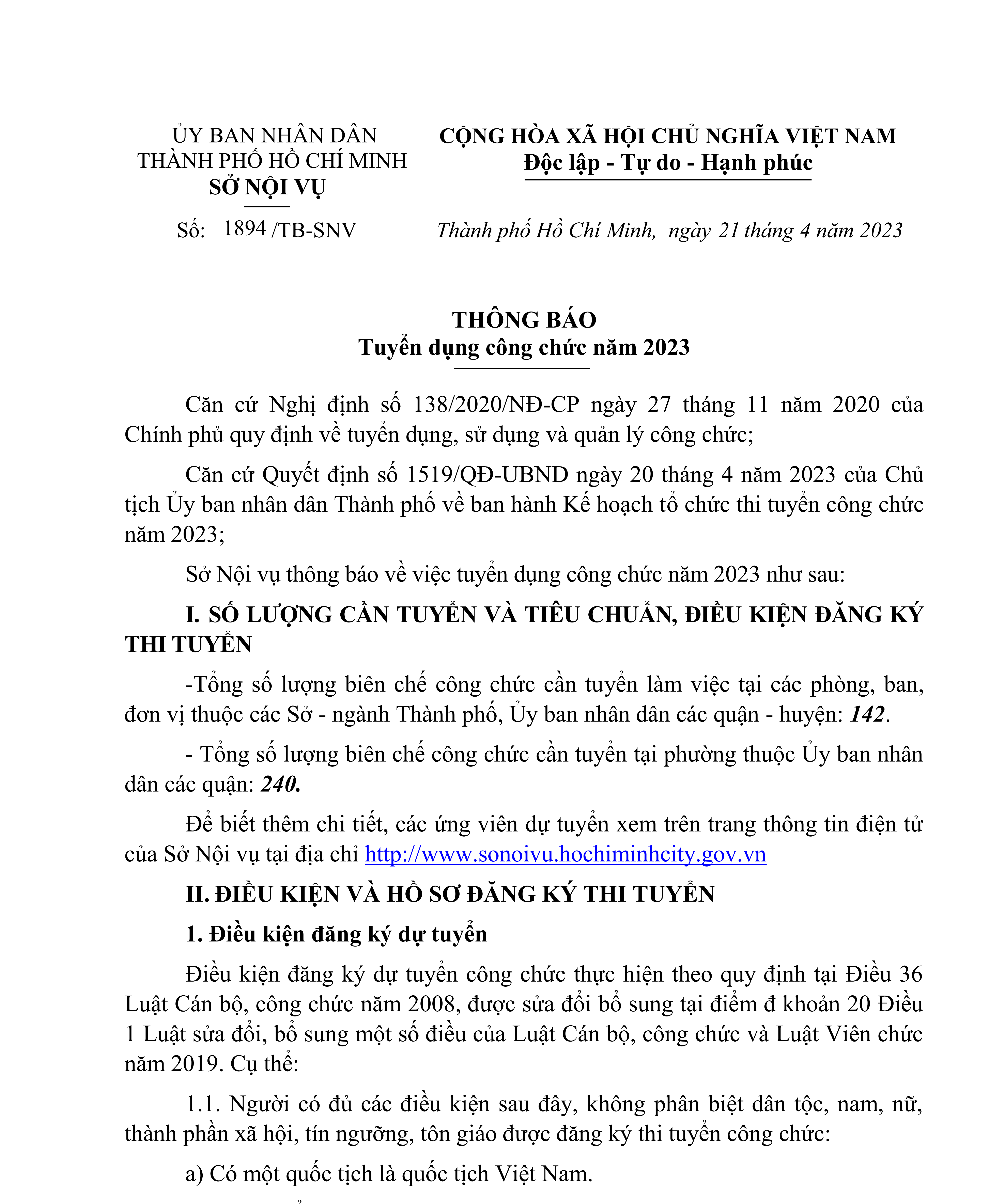 SỞ NỘI VỤ THÀNH PHỐ HỒ CHÍ MINH THÔNG BÁO TUYỂN DỤNG CÔNG CHỨC NĂM 2023