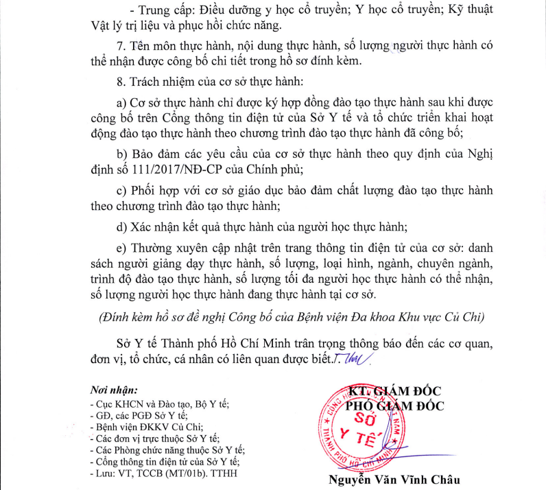 Thông báo số 993/TB-SYT ngày 13 tháng 3 năm 2024 của Sở Y tế về công bố Bệnh viện Đa khoa Khu vực Củ Chi đáp ứng yêu cầu là cơ sở thực hành trong đào tạo khối ngành sức khỏe, lần 2