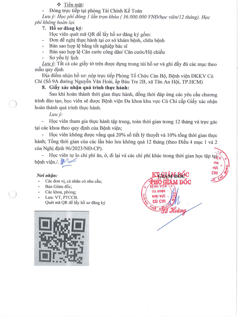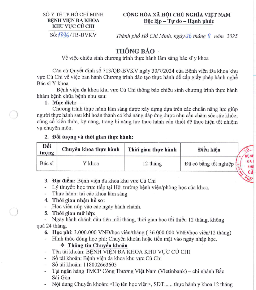 Thông báo (1896/TB-BVKV) V/v chiêu sinh chương trình thực hành lâm sàng bác sĩ y khoa