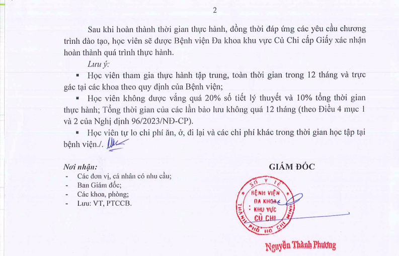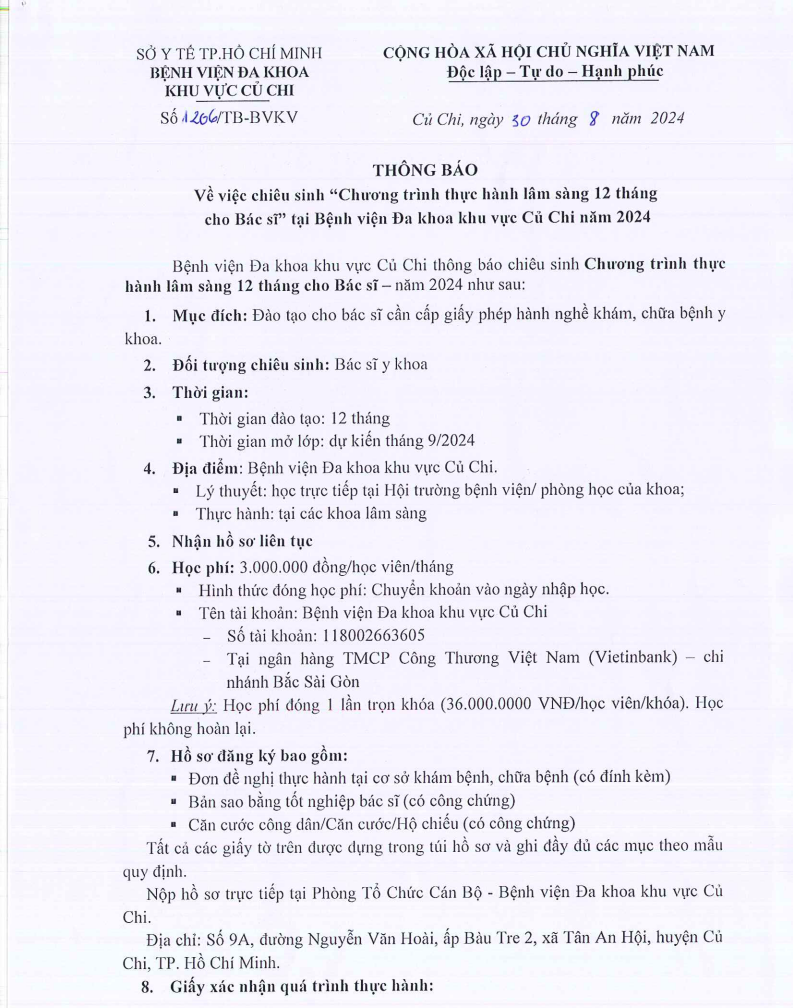 Thông báo chiêu sinh Chương trình thực hành lâm sàng 12 tháng cho Bác sĩ tại Bệnh viện Đa khoa khu vực Củ Chi năm 2024
