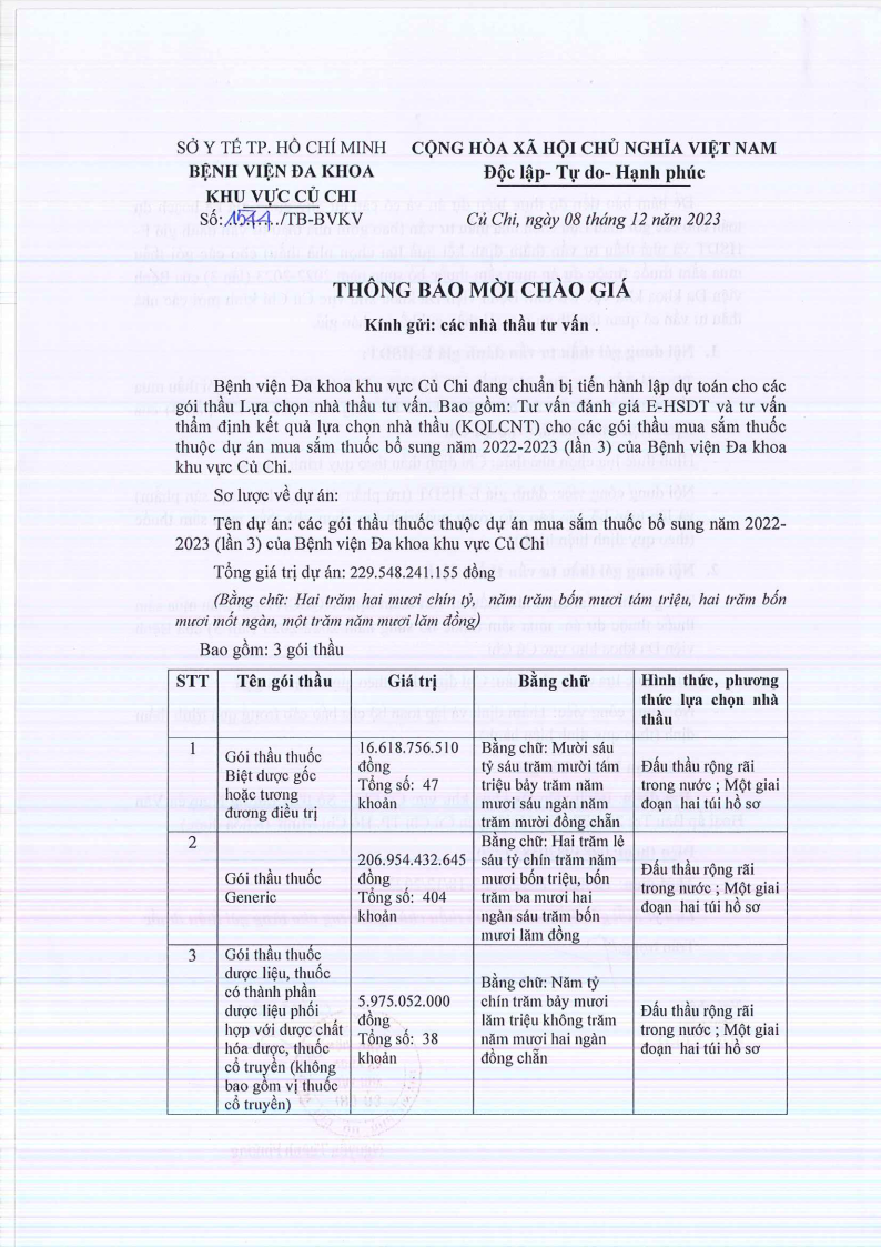 THÔNG BÁO MỜI CHÀO GIÁ (1544/TB-BVKV)