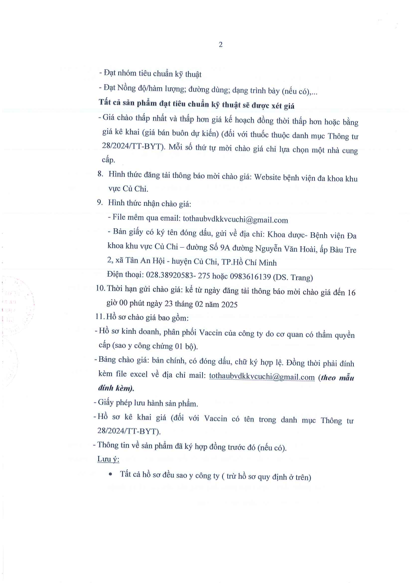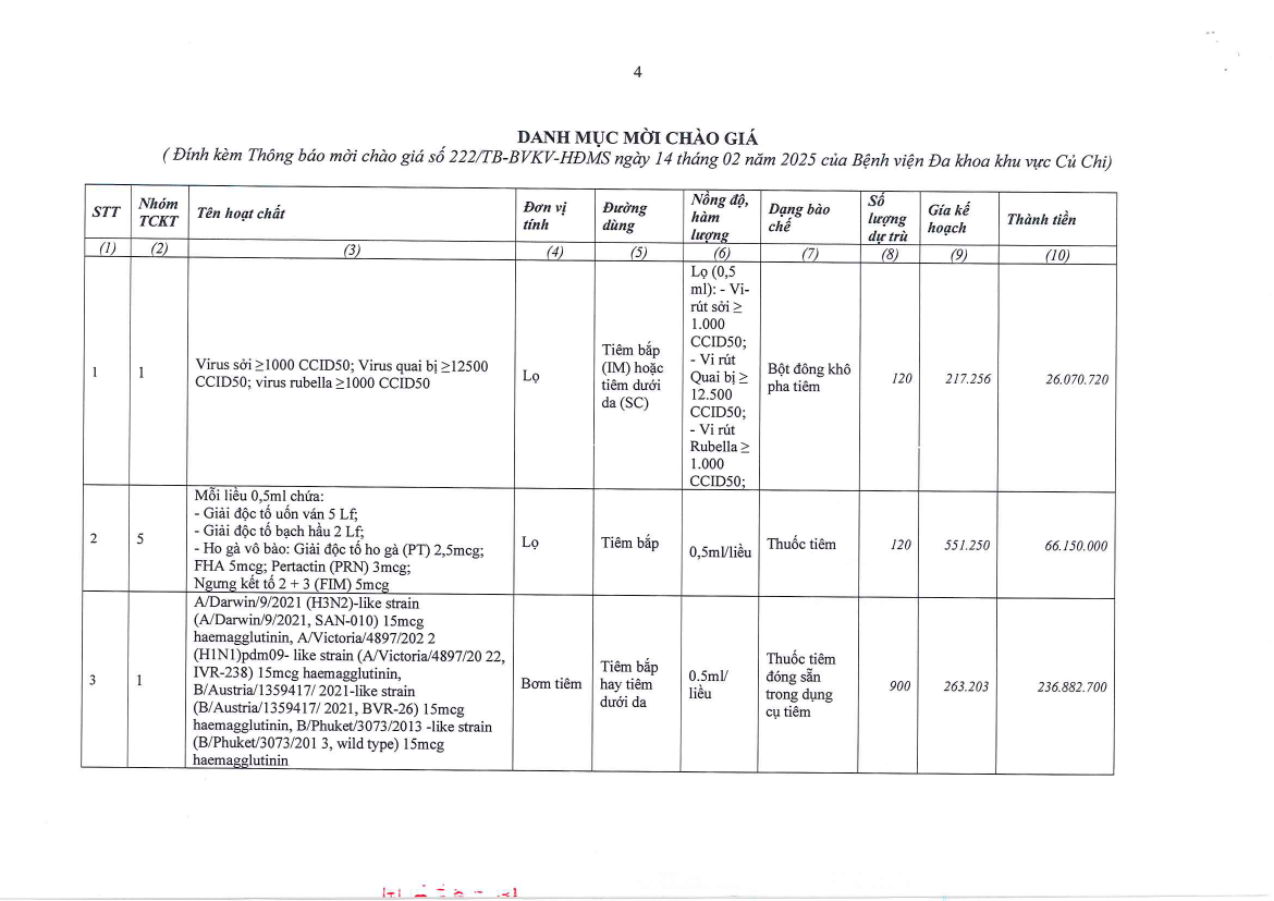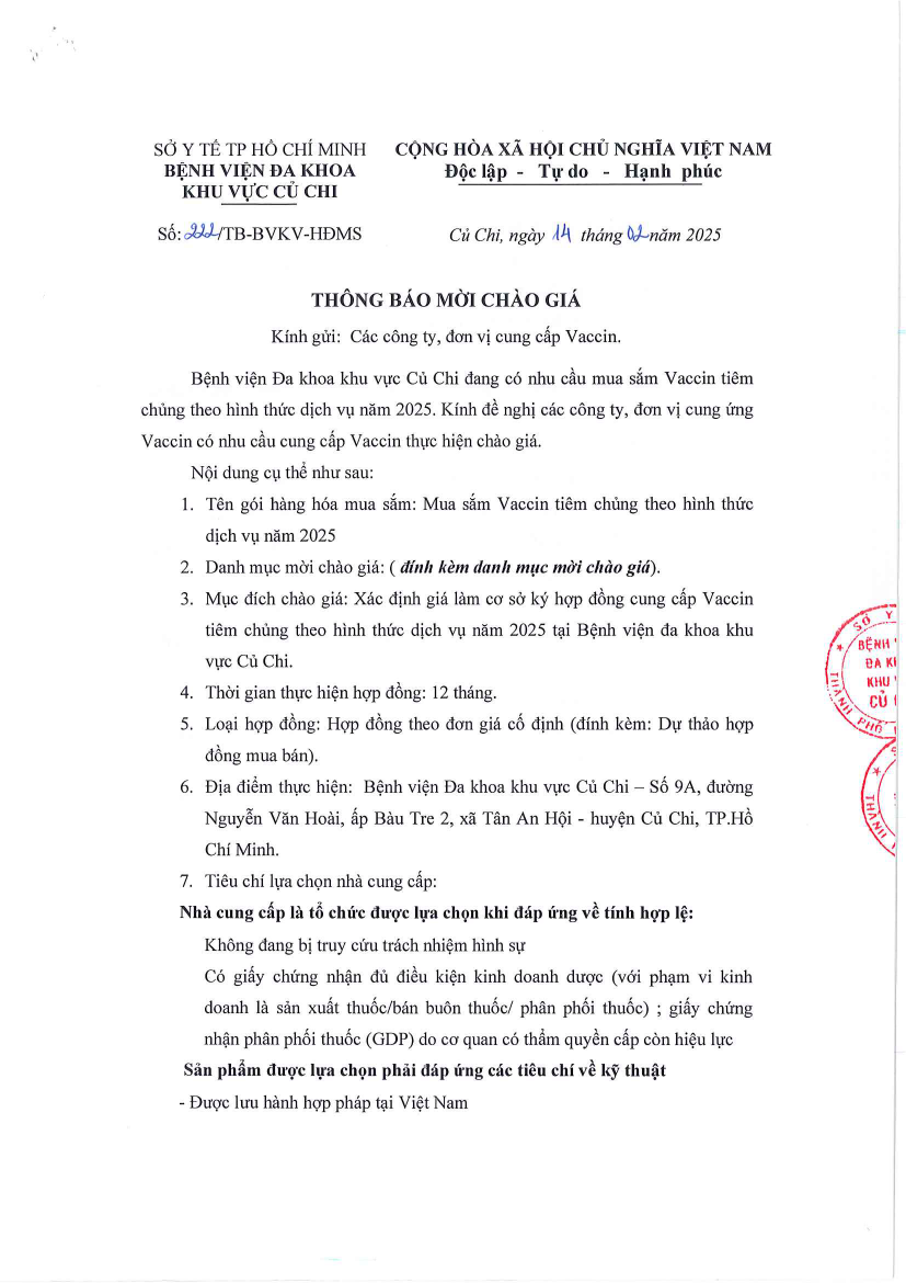Thông báo mời chào giá (222/TB-BVKV-HĐMS)