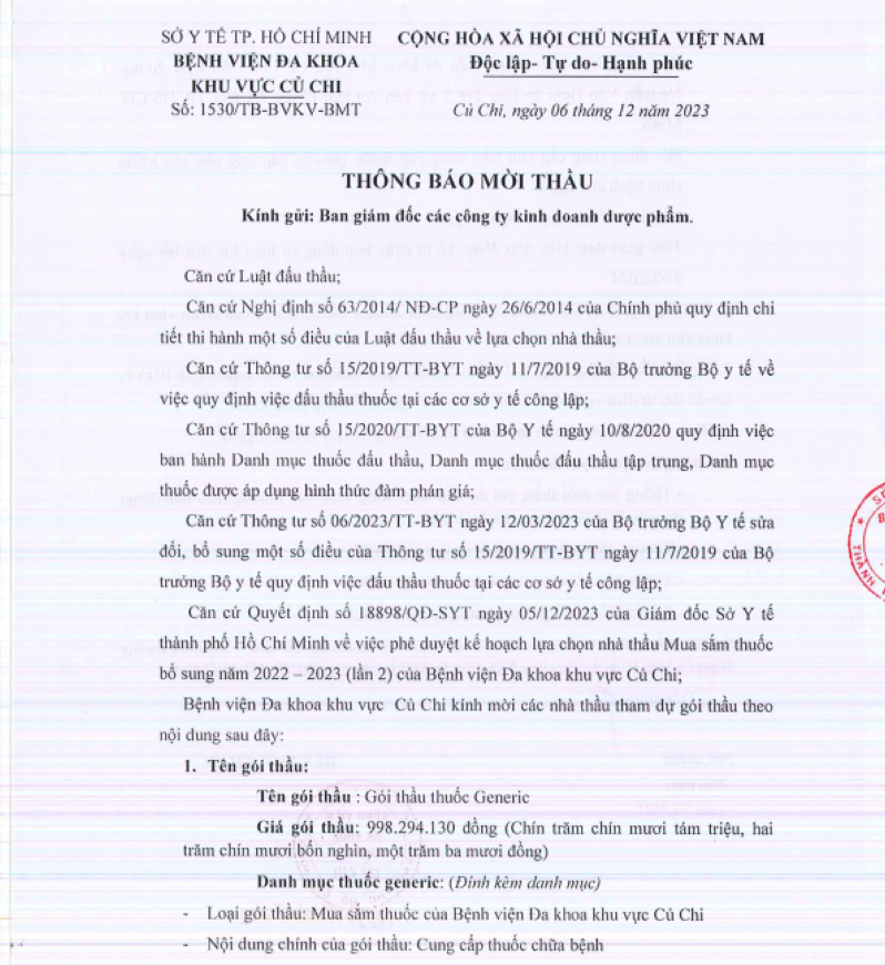 THÔNG BÁO MỜI THẦU (1530/TB-BVKV-BMT)