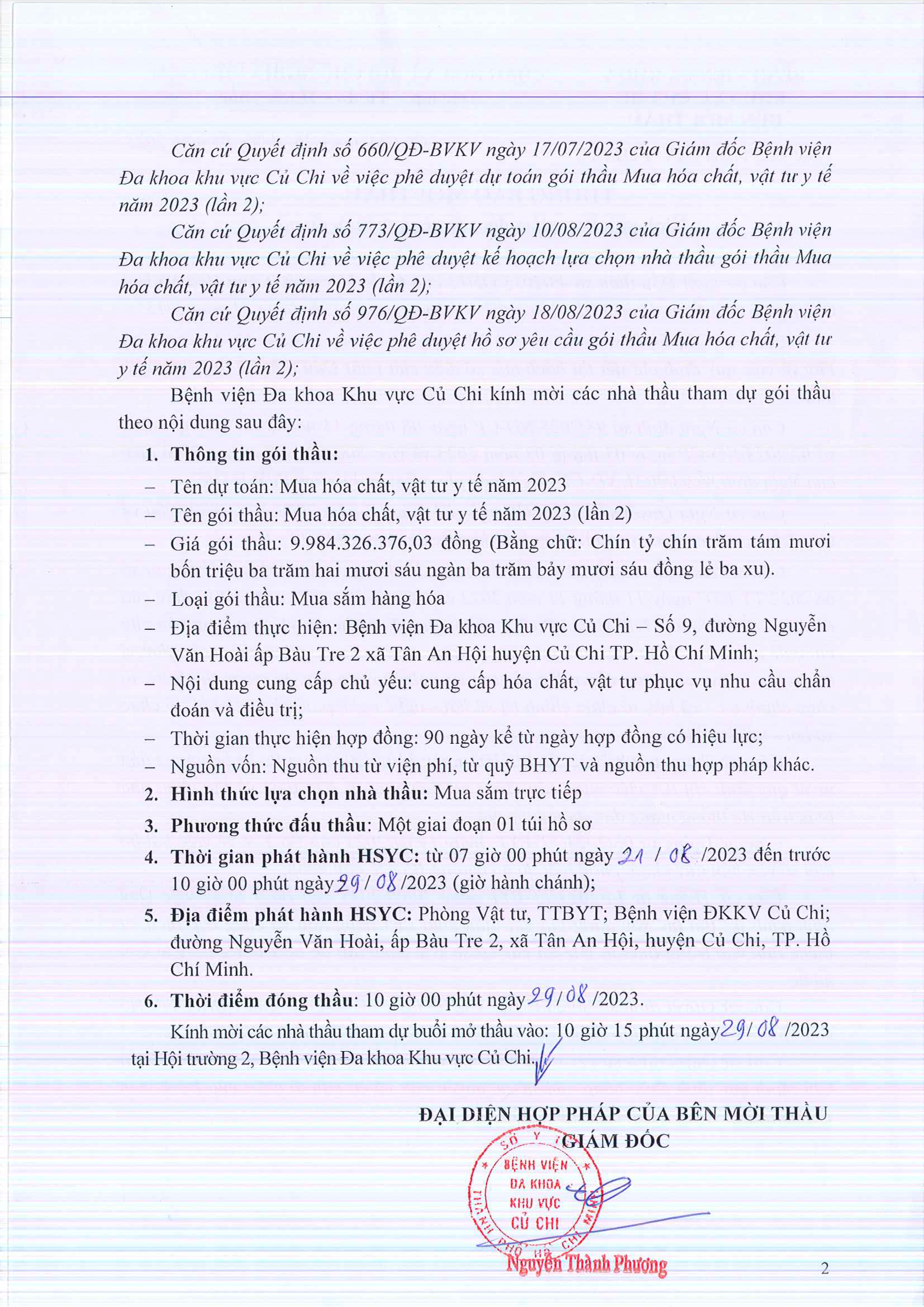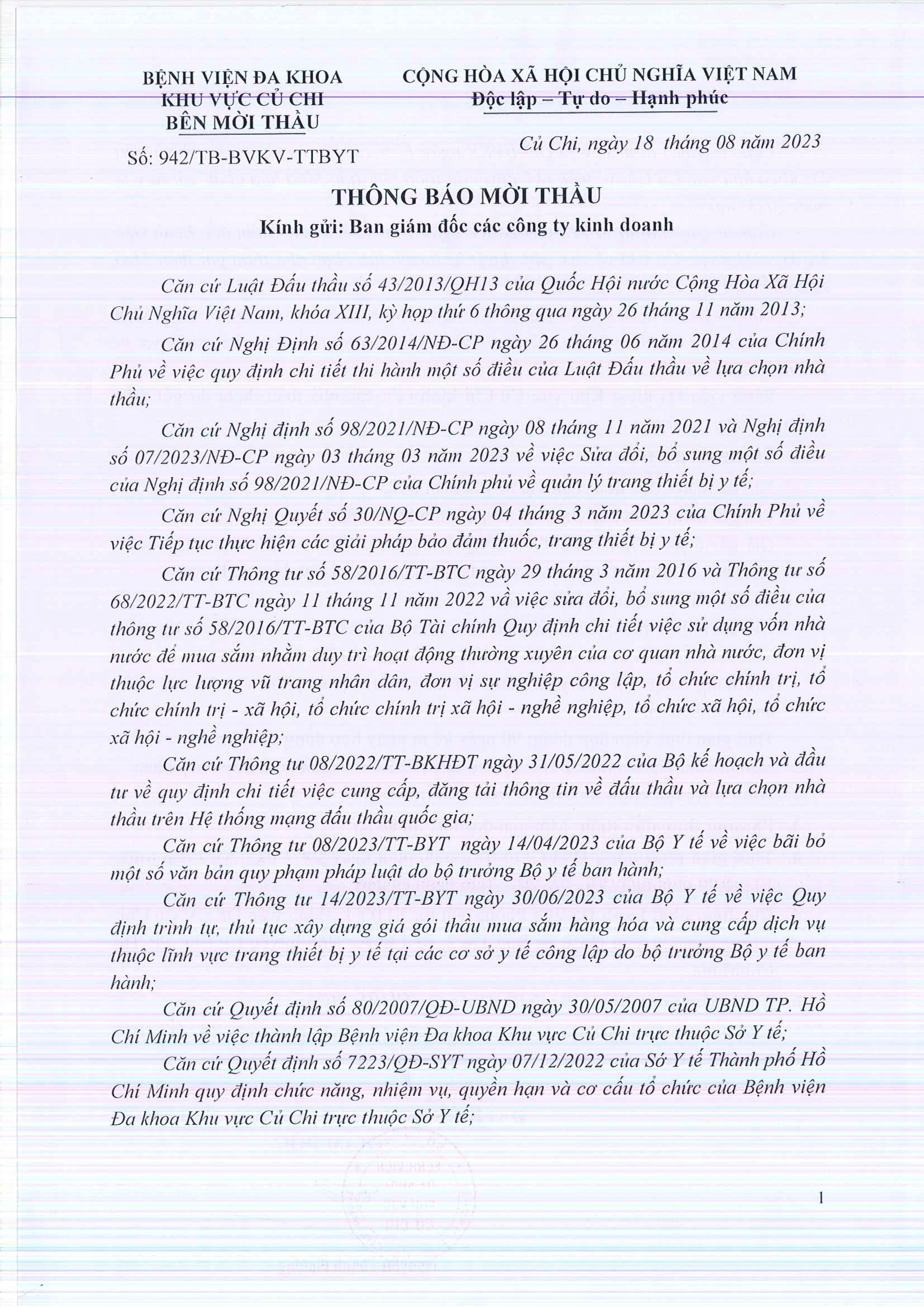 Thông báo mời thầu (942/TB-BVKV-TTBYT)