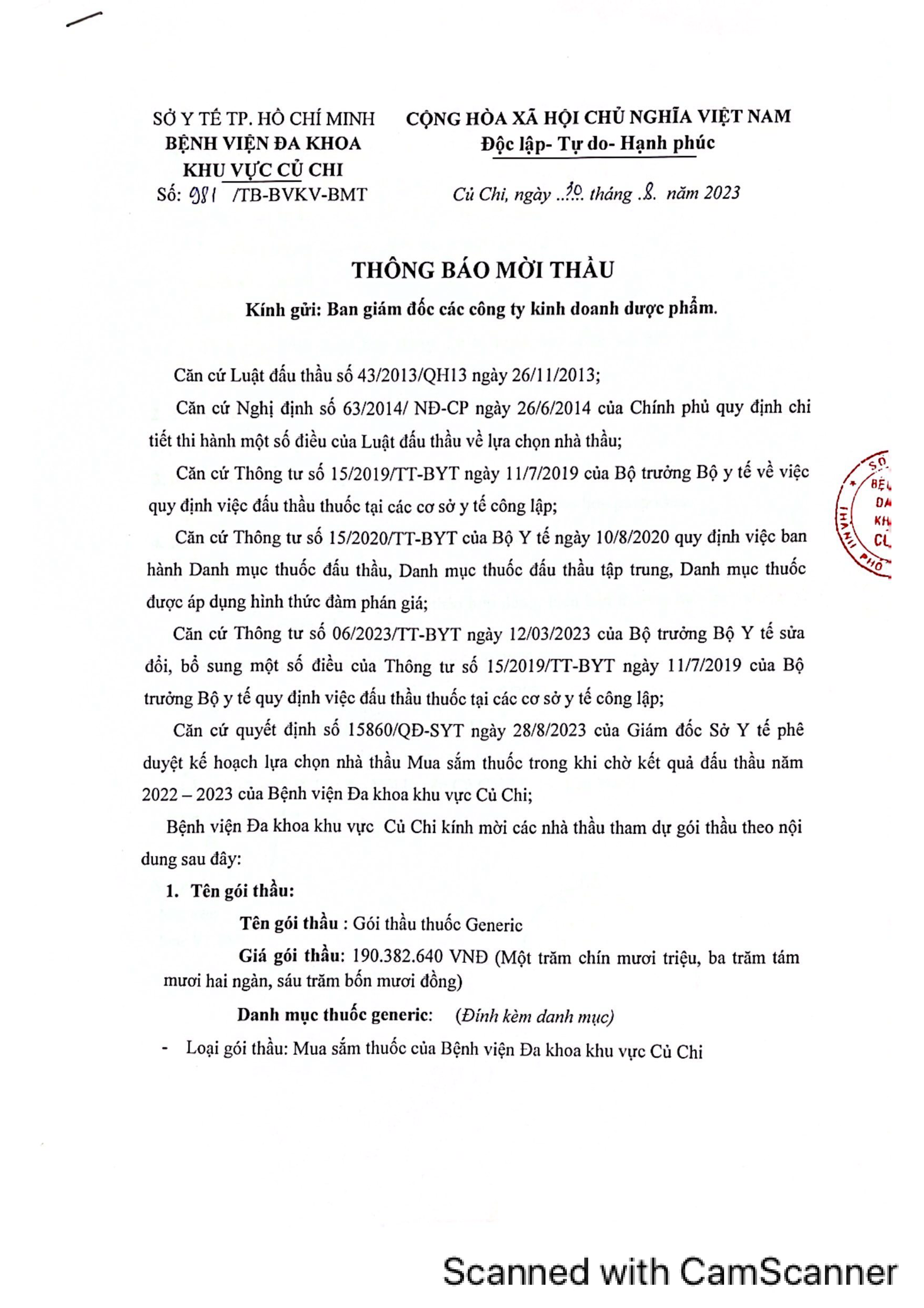 Thông báo mời thầu (981/TB-BVKV-BMT)