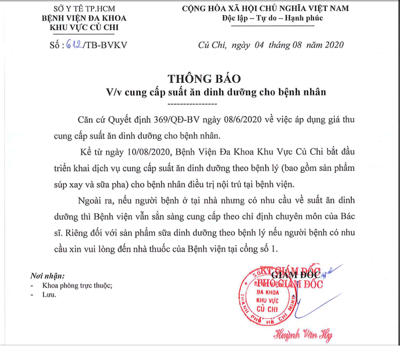 Thông báo về cung cấp suất ăn dinh dưỡng và bảng giá dịch vụ