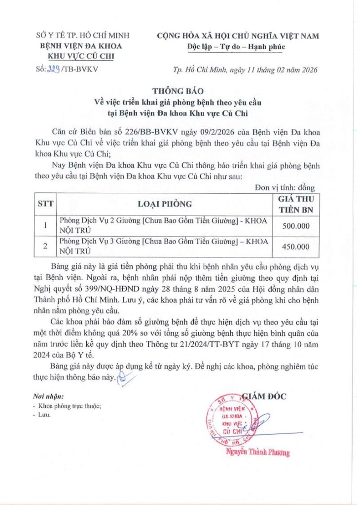 • Thông báo về việc triển khai giá phòng bệnh theo yêu cầu tại Bệnh viện Đa khoa khu vực Củ Chi