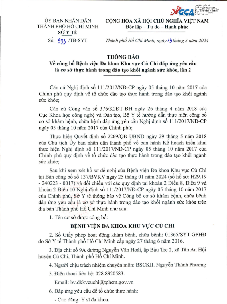 Thông báo số 993/TB-SYT ngày 13 tháng 3 năm 2024 của Sở Y tế về công bố Bệnh viện Đa khoa Khu vực Củ Chi đáp ứng yêu cầu là cơ sở thực hành trong đào tạo khối ngành sức khỏe, lần 2
