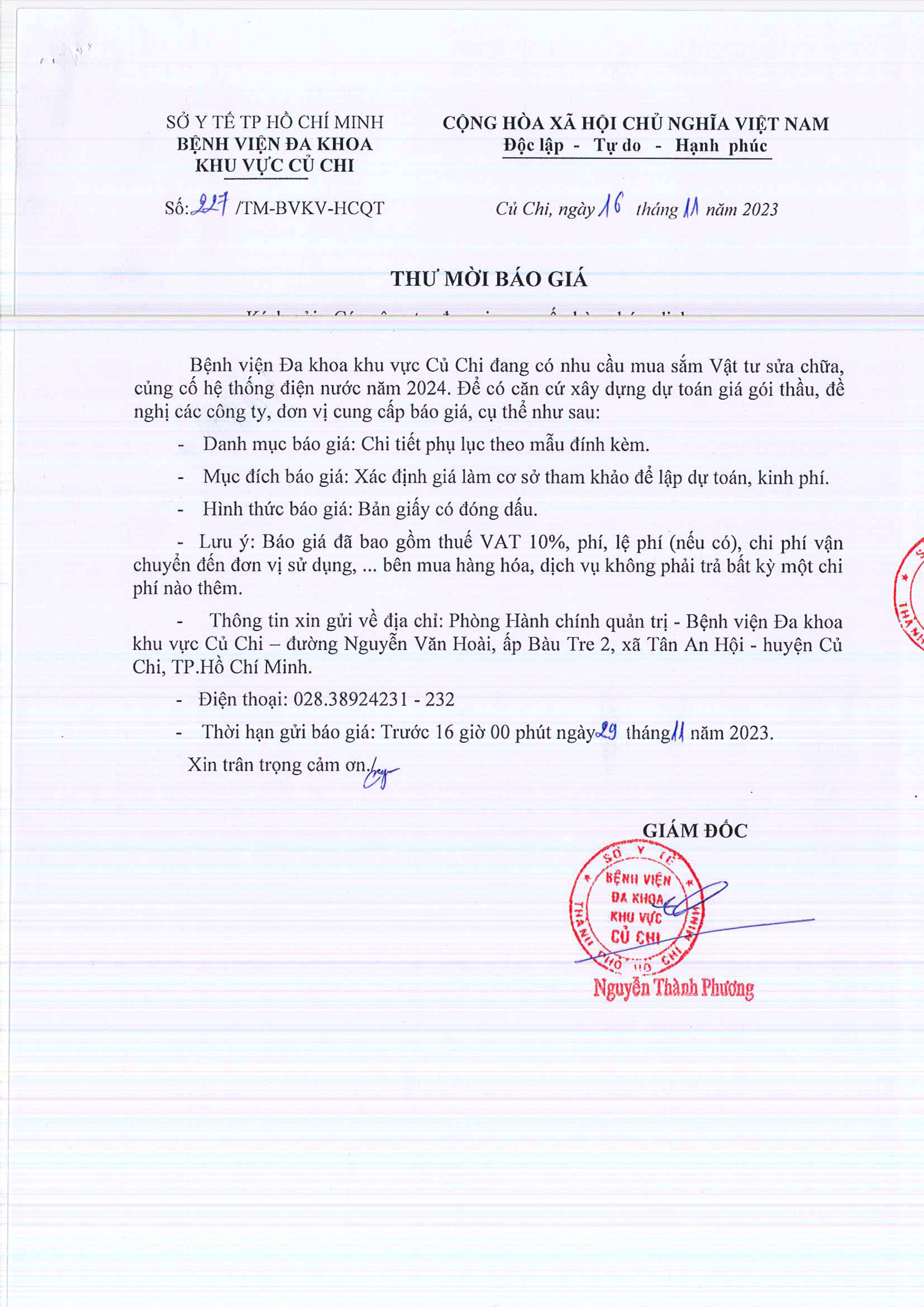 Thư mời báo giá (227/TM-BVKV-HCQT)