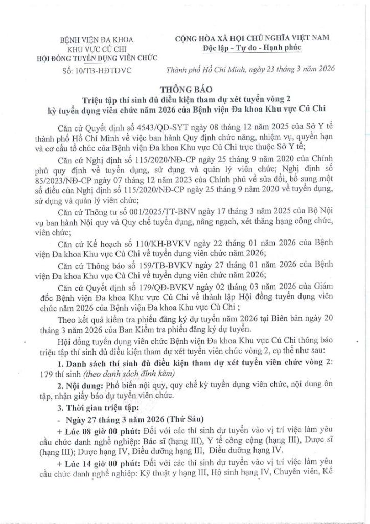 • Thông báo triệu tập thí sinh đủ điều kiện tham dự xét tuyển vòng 2 kỳ tuyển dụng viên chức năm 2026 của Bệnh viện Đa khoa khu vực Củ Chi