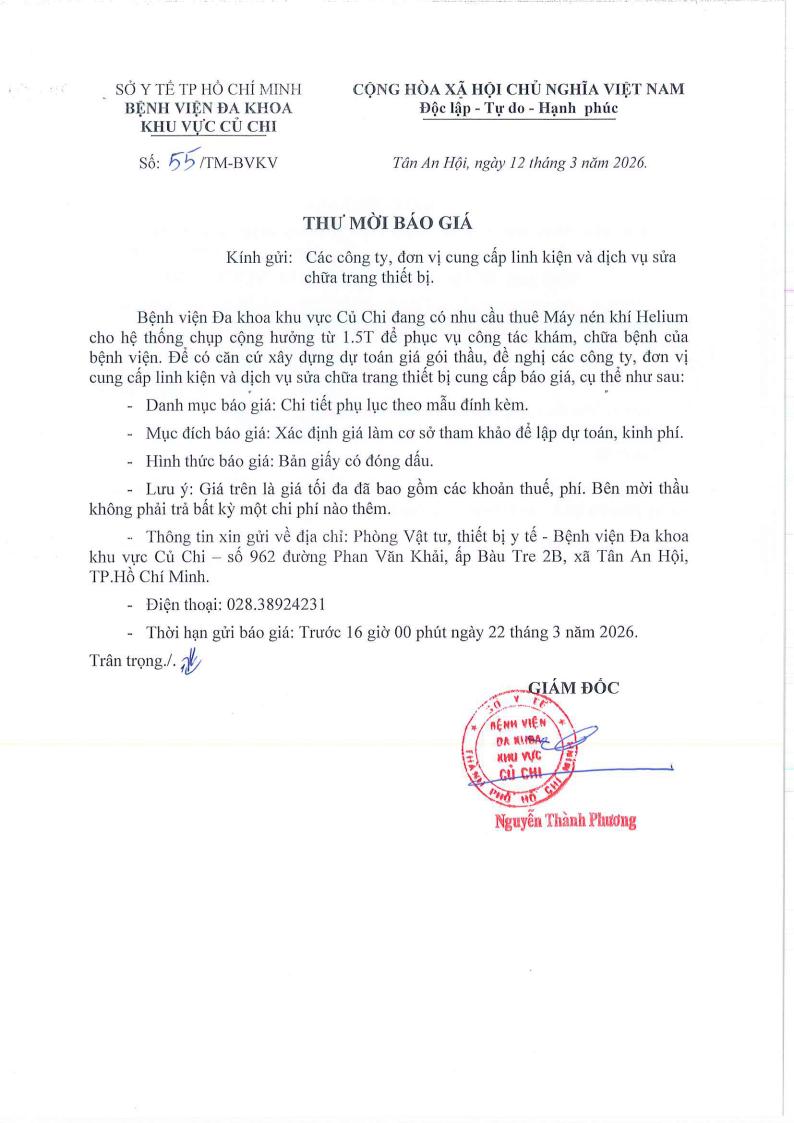Thư mời báo giá (55/TM-BVKV)