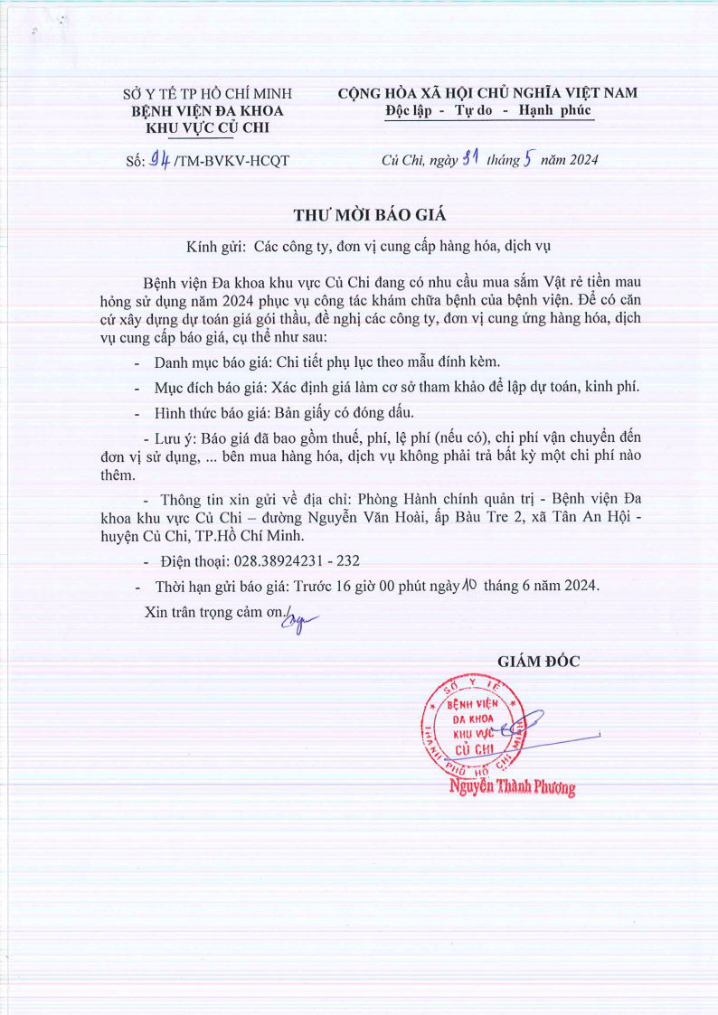 Thư mời báo giá (94/TM-BVKV-HCQT)