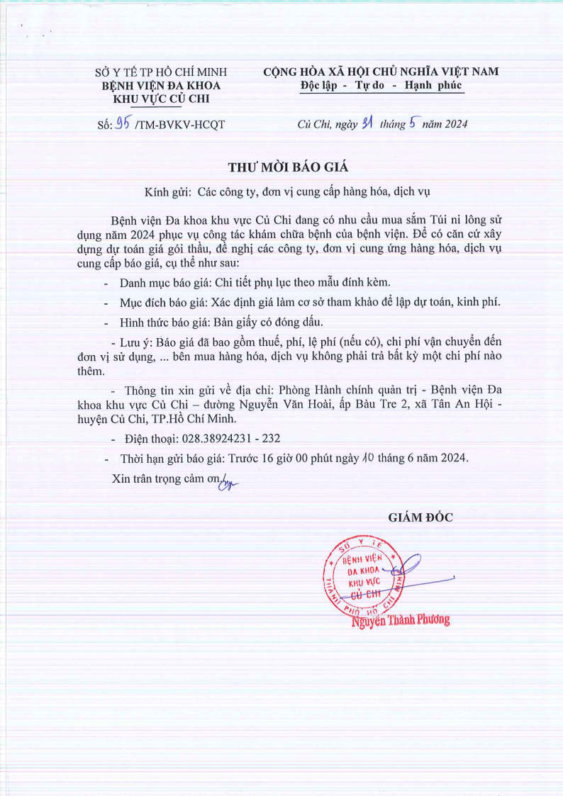 Thư mời báo giá (95/TM-BVKV-HCQT)