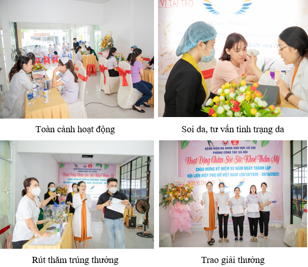 Kỷ niệm 92 năm ngày thành lập Hội LHPN Việt Nam, bệnh viện ĐKKV Củ Chi đã tổ chức nhiều hoạt động thiết thực tạo không khí vui tươi, sôi nổi bao gồm hoạt động “Chăm sóc sức khỏe thẩm mỹ” do phòng Công tác xã hội phối hợp thực hiện cùng Spa Lam Thanh được diễn ra với nhiều nội dung hấp dẫn như: Soi da, tư vấn tình trạng da, tư vấn thẩm mỹ điều trị mụn, thâm, nám, tàn nhang, tặng Voucher chăm sóc da, rút thăm trúng thưởng… Hoạt động đã đáp ứng được nhu cầu thực tiễn tại đơn vị trong việc chăm lo đời sống tinh thần cho viên chức, người lao động và tôn vinh giá trị của nữ giới trong xu thế hướng đến bình đẳng giới. Đây cũng là dịp để chị em phụ nữ tại đơn vị gặp gỡ, giao lưu, học hỏi về các giải pháp chăm sóc sức khỏe thẩm mỹ, hoàn thiện bản thân để hoàn thành tốt nhiệm vụ và thêm tự tin trong cuộc sống.