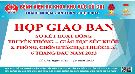 Chiều ngày 30 tháng 8 năm 2023, tại hội trường 1 – Bệnh viện đa khoa khu vực Củ Chi tổ chức buổi họp giao ban “Sơ kết hoạt động Truyền thông – Giáo dục Sức khỏe và Phòng chống tác hại thuốc lá 6 tháng đầu năm 2023”. Đến dự buổi hợp giao ban với sự chủ trì của BSCKII. Lê Hoàng – Phó giám đốc bệnh viện, Tổ Trưởng tổ truyền thông – giáo dục sức khỏe (TT-GDSK), Trưởng ban phòng chống tác hại thuốc lá (PCTHTL) bệnh viện cùng sự tham gia của hơn 60 các thành viên đến từ tổ T3G, mạng lưới TT-GDSK T2G, thành viên Ban PCTHTL bệnh viện, thành viên các tổ PCTHTL các khoa.
